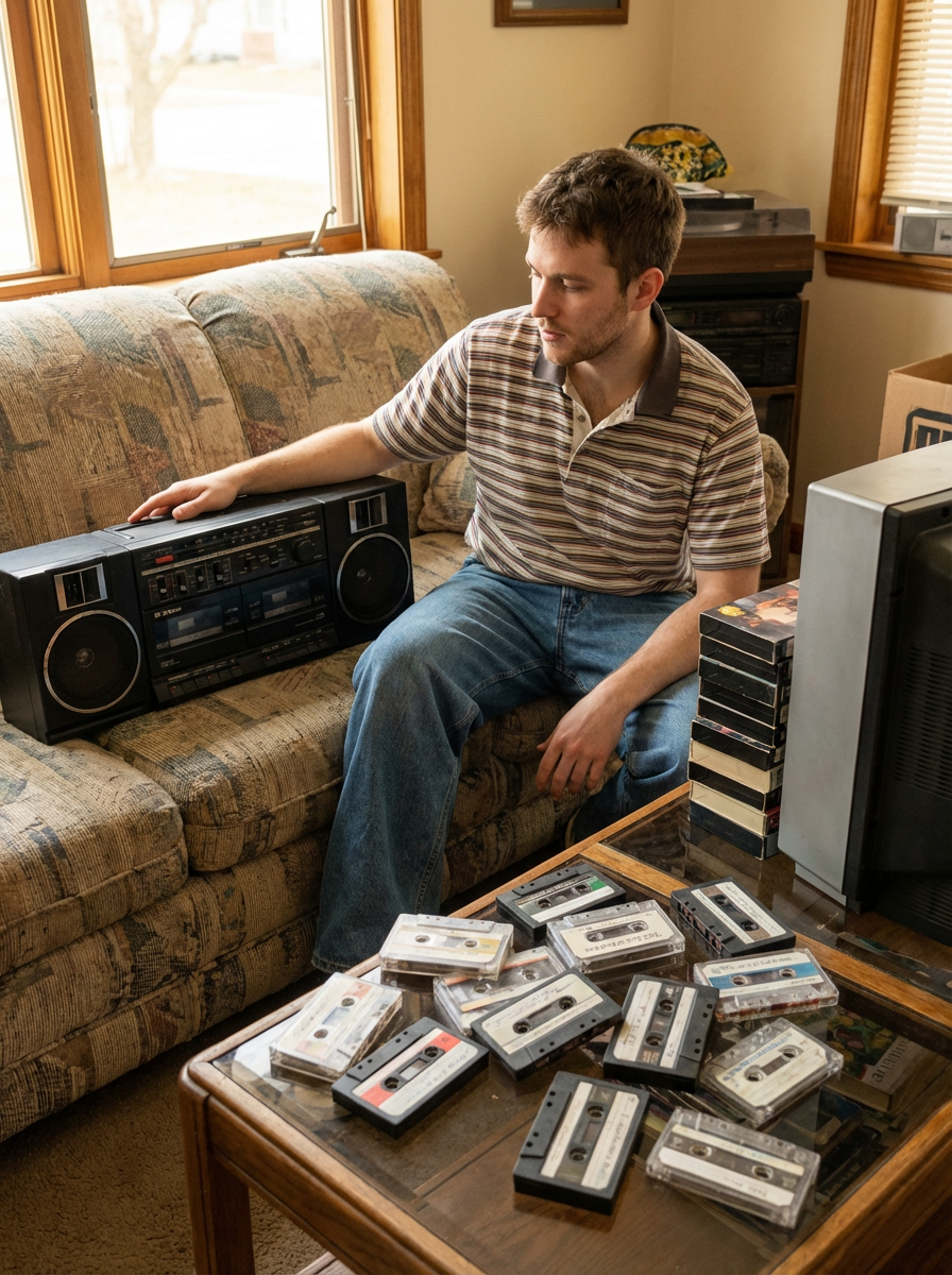 model in a 90s living room, wearing wide-leg jeans and a polo shirt, sitting next to a boombox with dual cassette decks, collection of mixtapes spread on a glass coffee table, VHS tapes stacked by a tube TV
