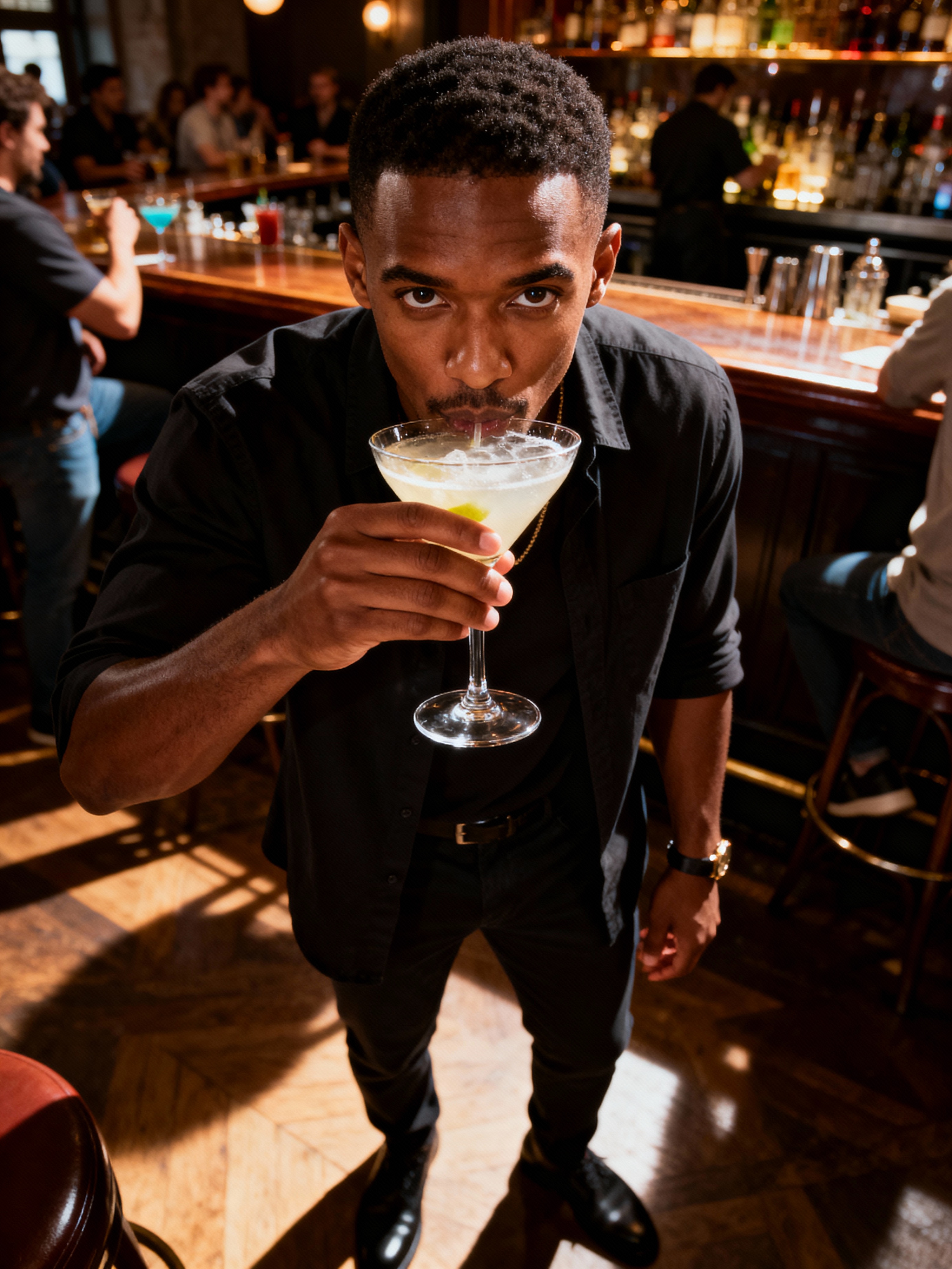 model in a busy bar drinking mocktail. holding an intact glass mocktail
