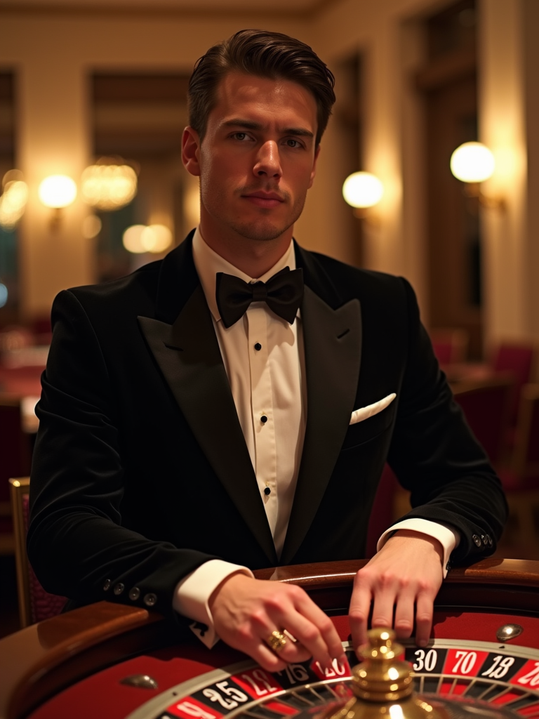 model in a casino at the Roulette table. at night. the model wears a refined outfit, like a classic tuxedo or well-fitted suit, reflecting the opulence of the casino.
