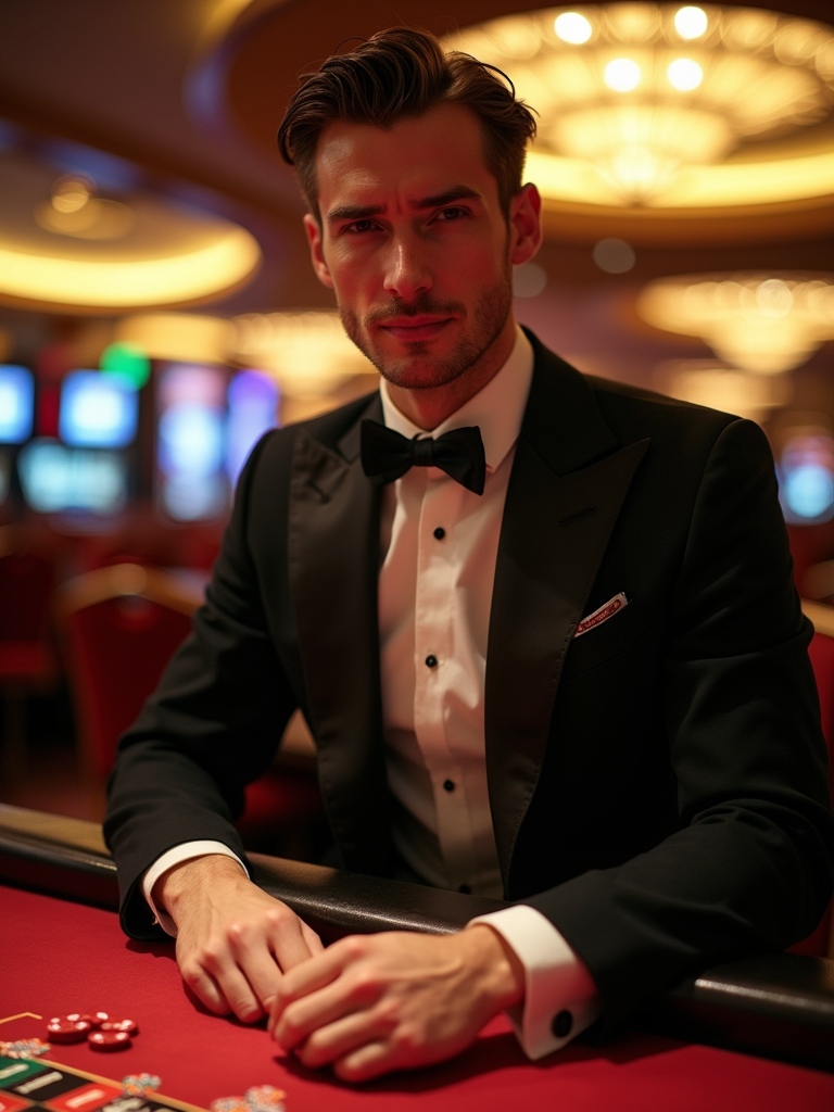 model in a casino at the Roulette table. at night. the model wears a refined outfit, like a classic tuxedo or well-fitted suit, reflecting the opulence of the casino.