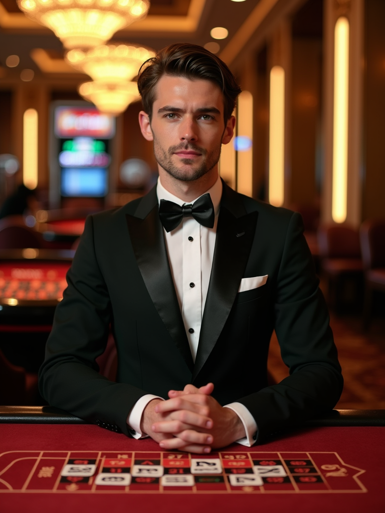 model in a casino at the Roulette table. at night. the model wears a refined outfit, like a classic tuxedo or well-fitted suit, reflecting the opulence of the casino.