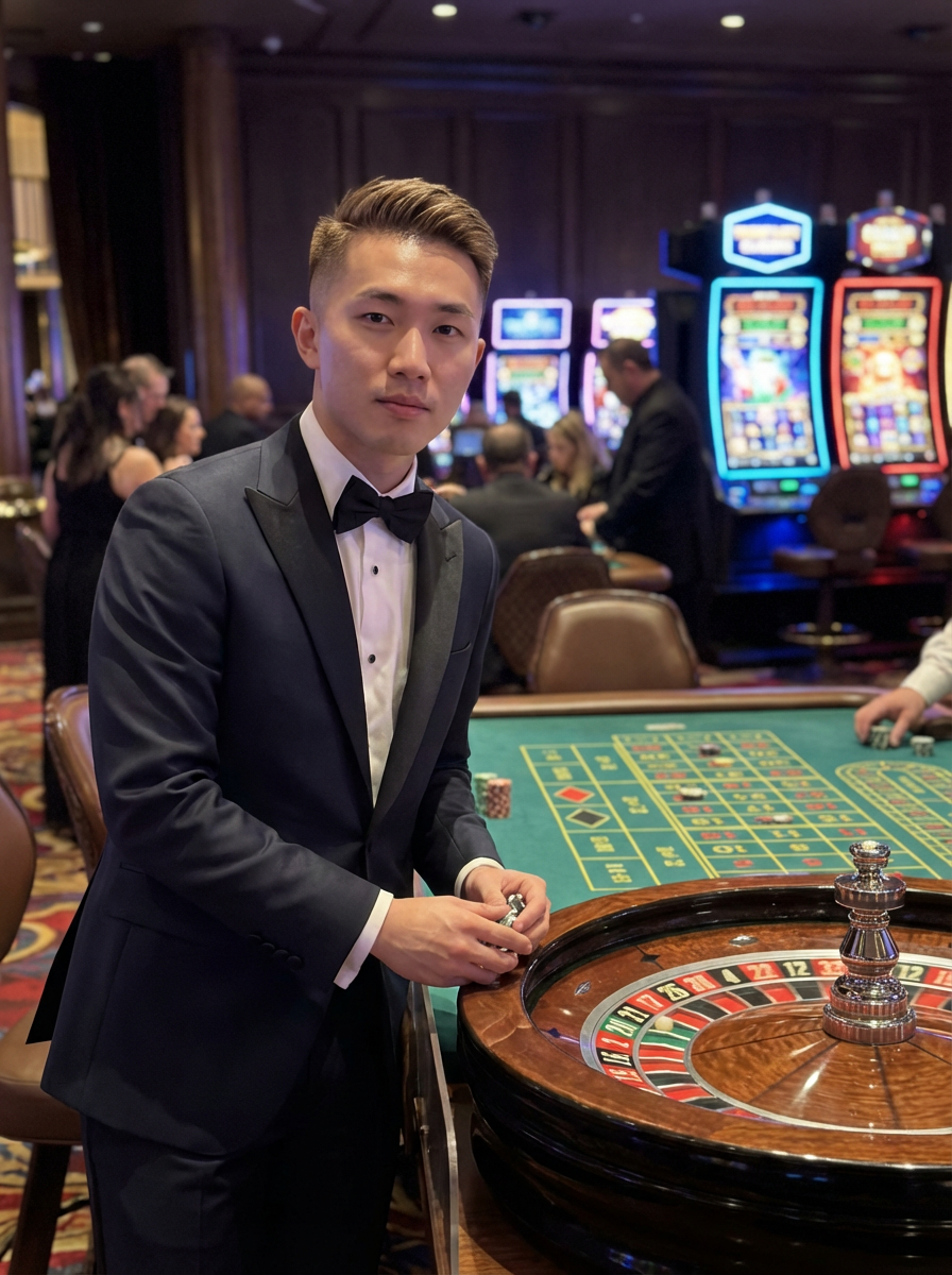 model in a casino at the Roulette table. at night. the model wears a refined outfit, like a classic tuxedo or well-fitted suit.