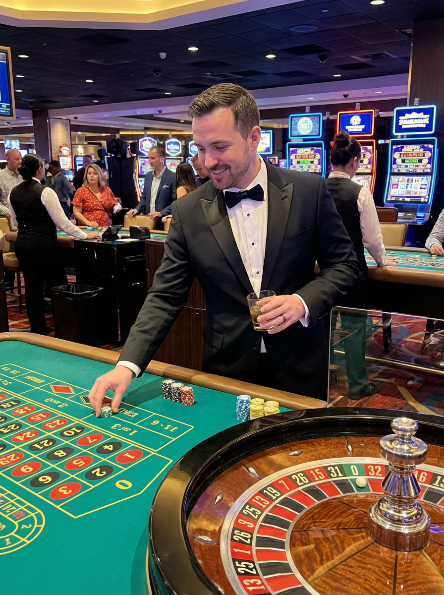 model in a casino at the Roulette table. at night. the model wears a refined outfit, like a classic tuxedo or well-fitted suit.