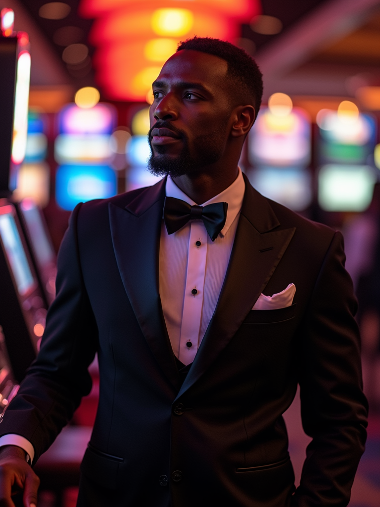 model in a casino at the Slot Machines. at night. the model wears a refined outfit, like a classic tuxedo or well-fitted suit, reflecting the opulence of the casino.