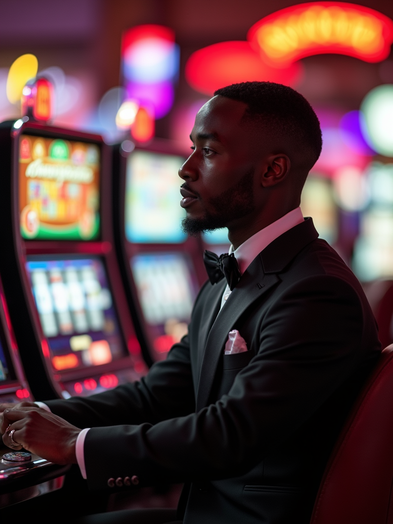 model in a casino at the Slot Machines. at night. the model wears a refined outfit, like a classic tuxedo or well-fitted suit, reflecting the opulence of the casino.