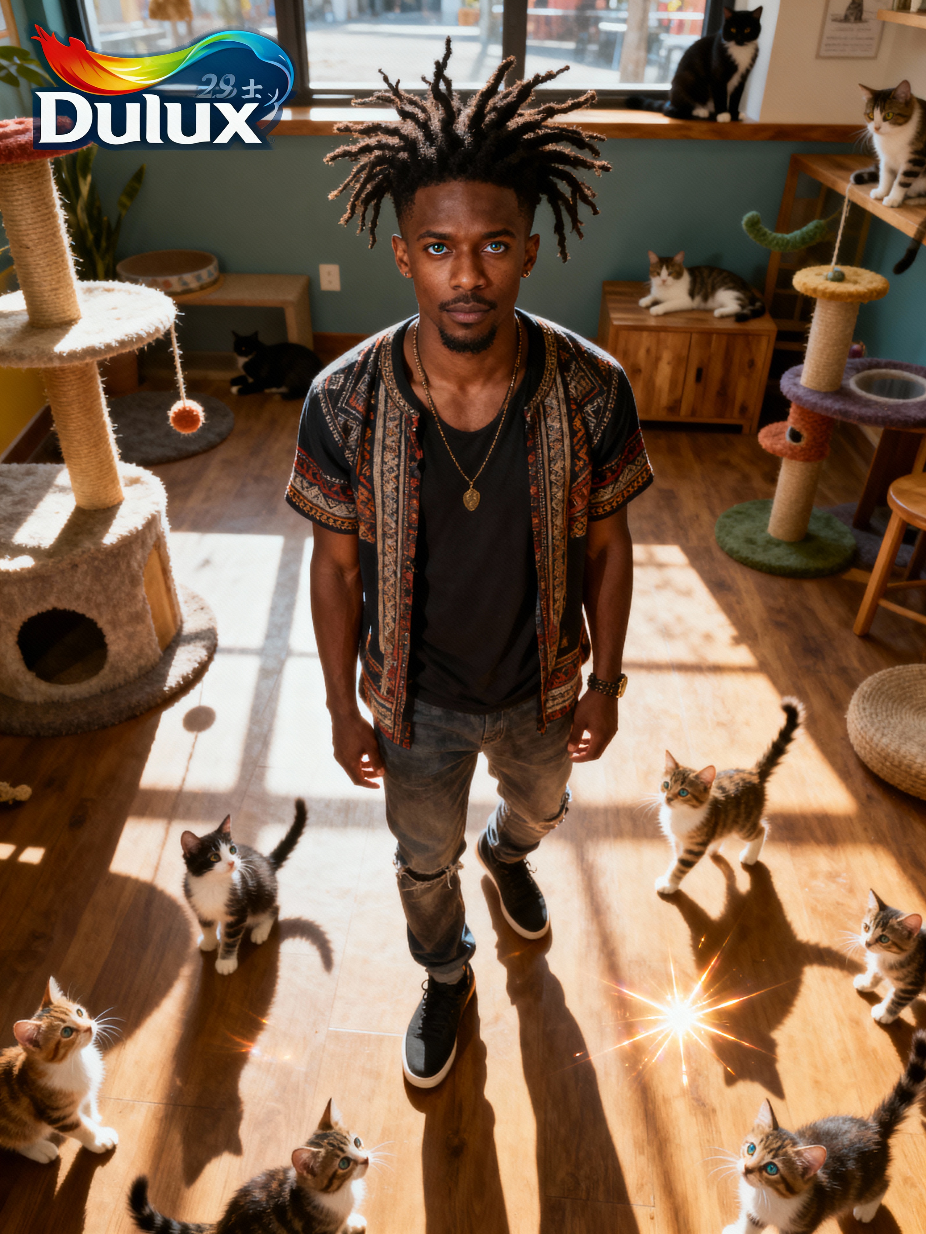 model in a Cat Cafe with many cute Cats and Kittens around them