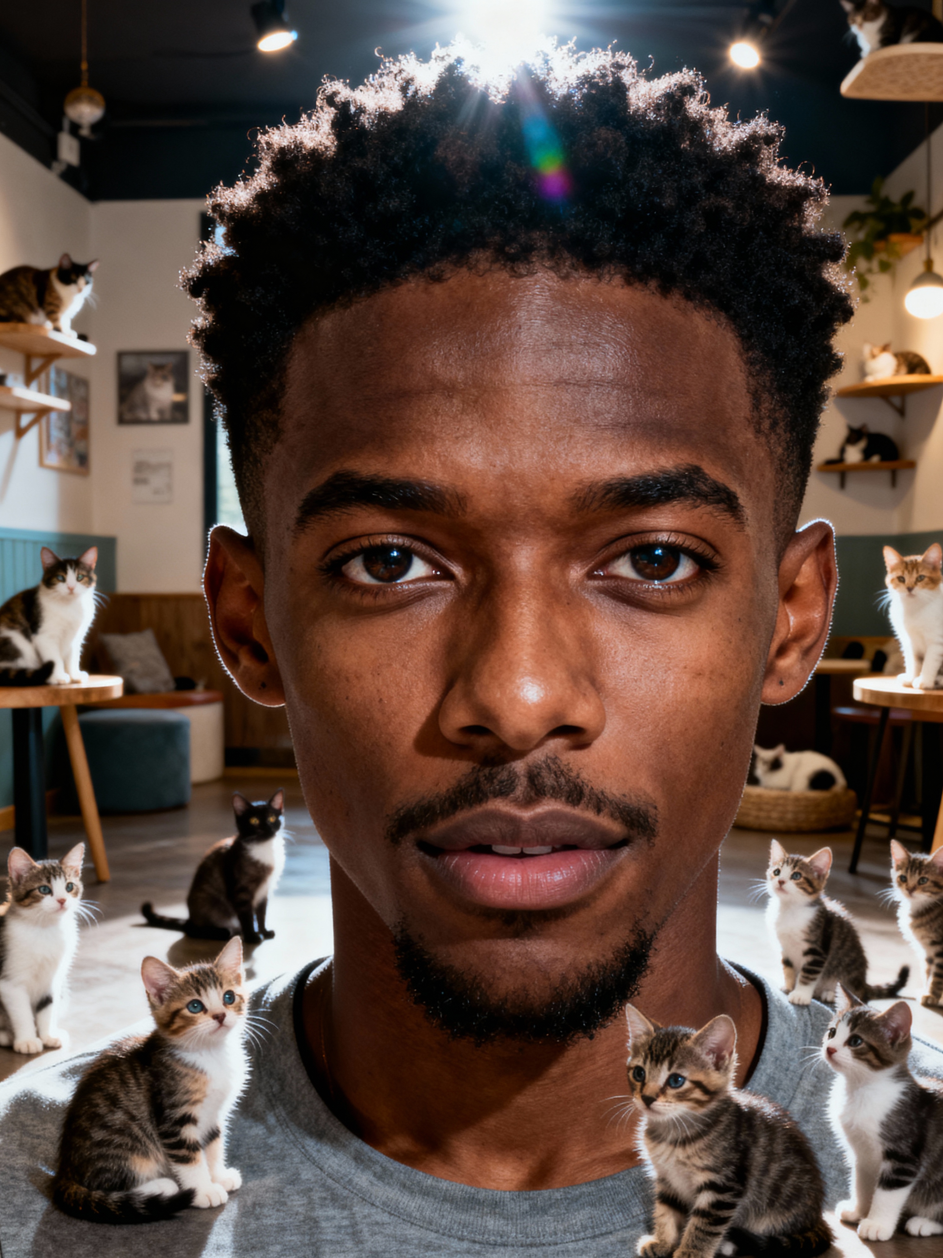 model in a Cat Cafe with many cute Cats and Kittens around them