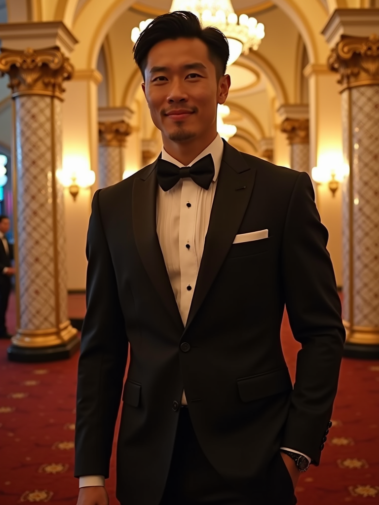 model in a classic Las Vegas casino, like Caesars Palace or Bellagio. at night. the model wears a refined outfit, like a classic tuxedo or well-fitted suit, reflecting the opulence of the casino.