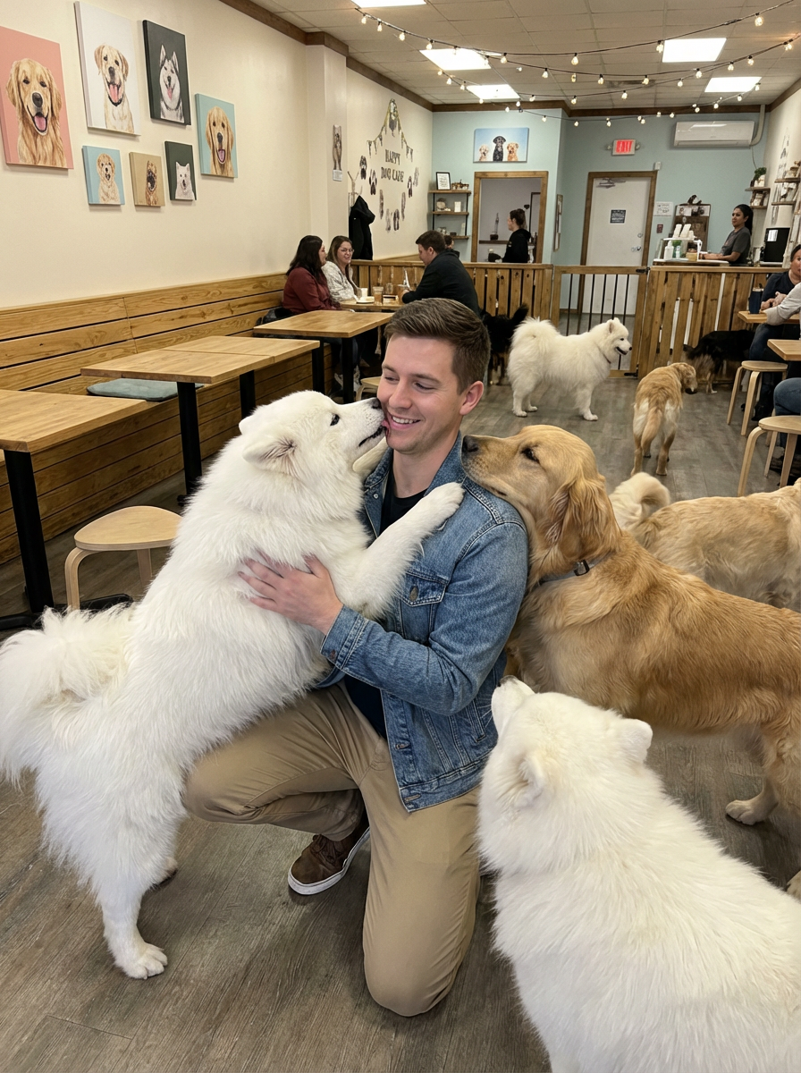 model in a Dog Cafe with many cute Samoyed and Golden Retriever dogs