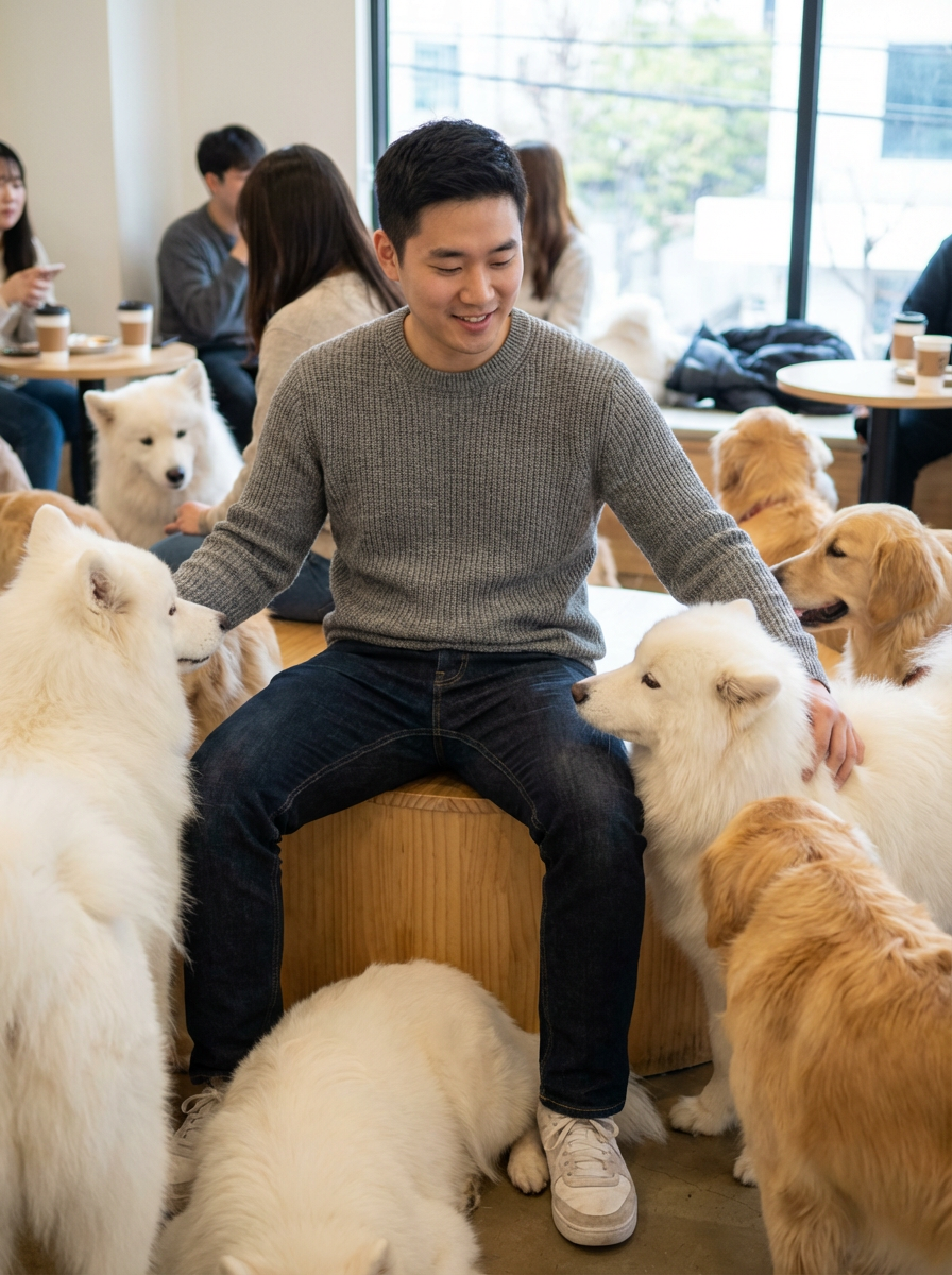 model in a Dog Cafe with many cute Samoyed and Golden Retriever dogs