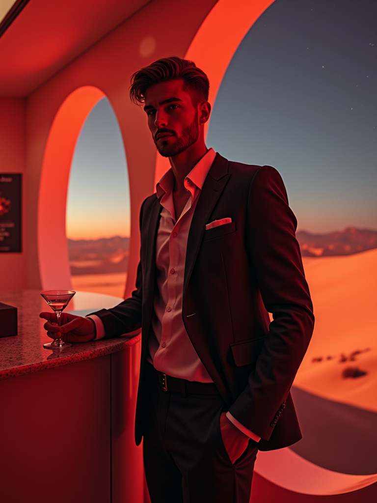 model in a futuristic coktail bar on Mars. at night. indoors with futuristic interior. Mars red dunes is visible in big windows. model wears a suit.