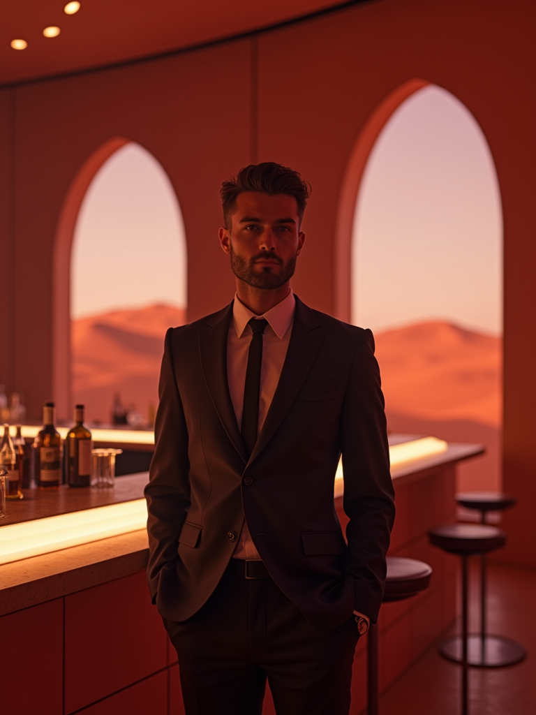 model in a futuristic coktail bar on Mars. at night. indoors with futuristic interior. Mars red dunes is visible in big windows. model wears a suit.