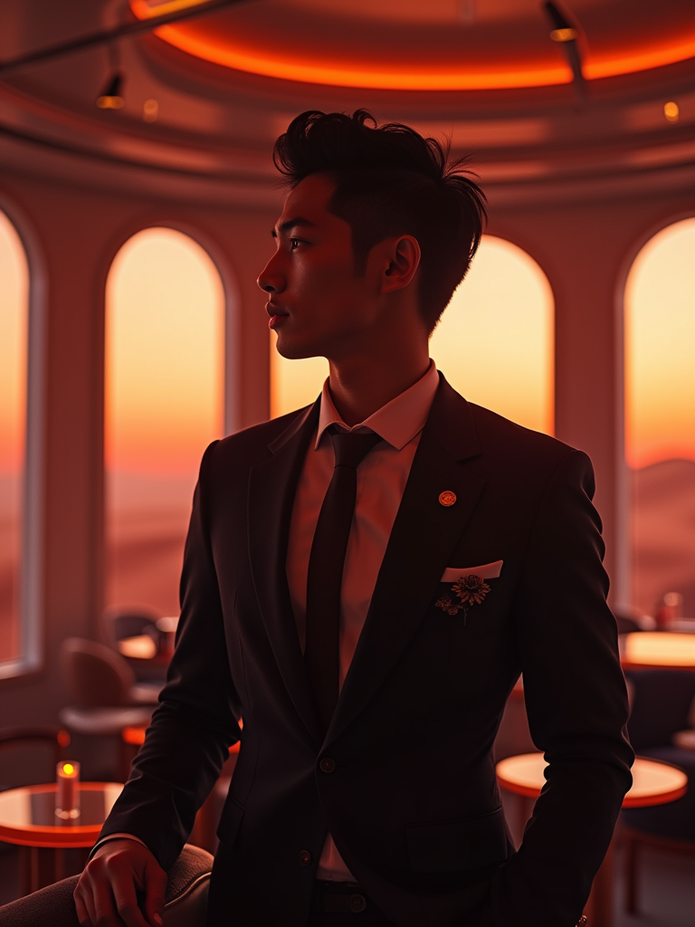 model in a futuristic coktail bar on Mars. at night. indoors with futuristic interior. Mars red dunes is visible in big windows. model wears a suit.