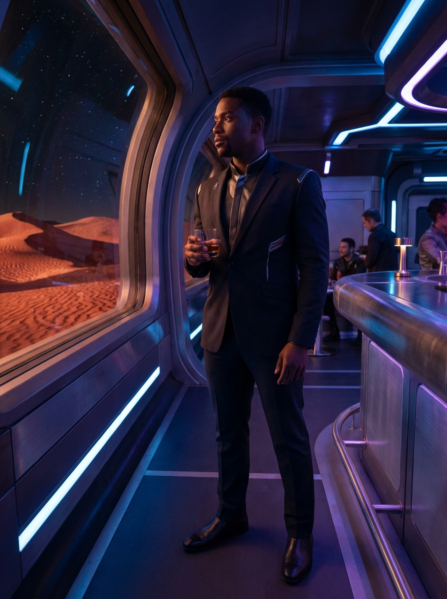 model in a futuristic coktail bar on Mars. at night. indoors with futuristic interior. Mars red dunes is visible in big windows. model wears a suit.