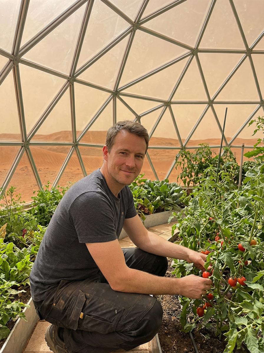 model in a futuristic geodesic glass dome growing plants, fruits and vegetables on Mars, with the Mars red dunes visible in windows. model wears a t-shirt and work pants.