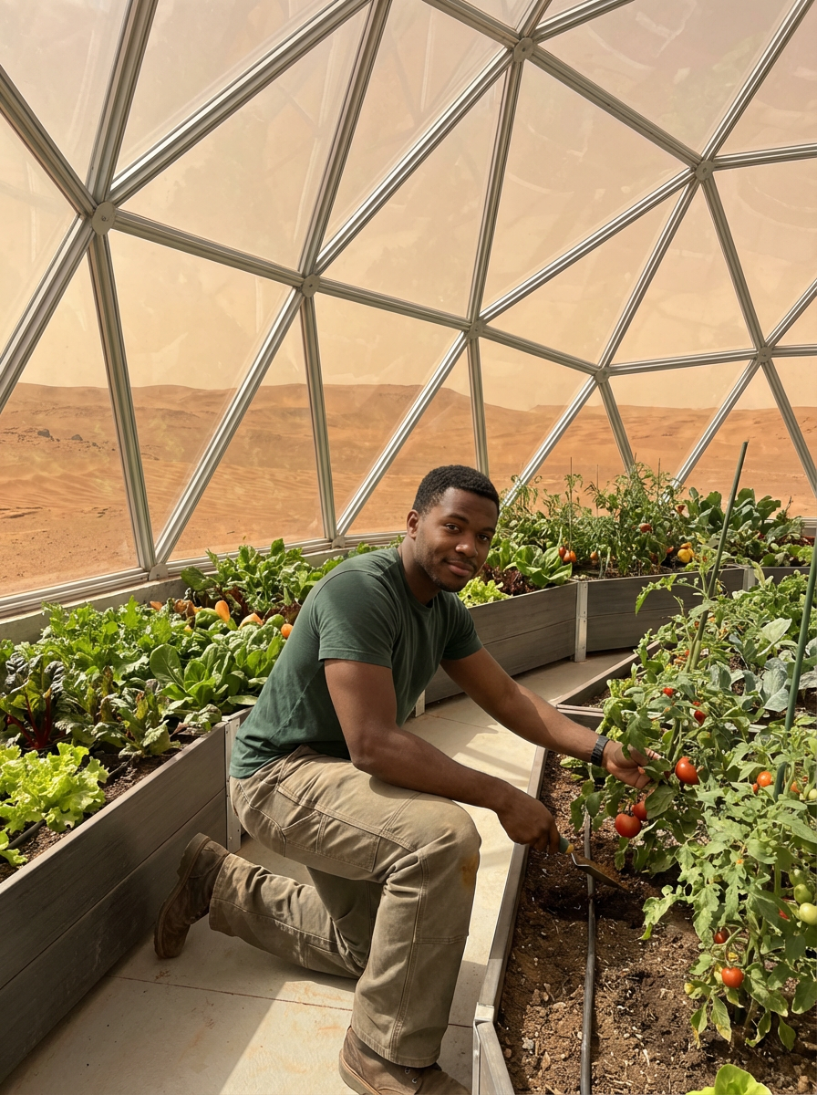 model in a futuristic geodesic glass dome growing plants, fruits and vegetables on Mars, with the Mars red dunes visible in windows. model wears a t-shirt and work pants.