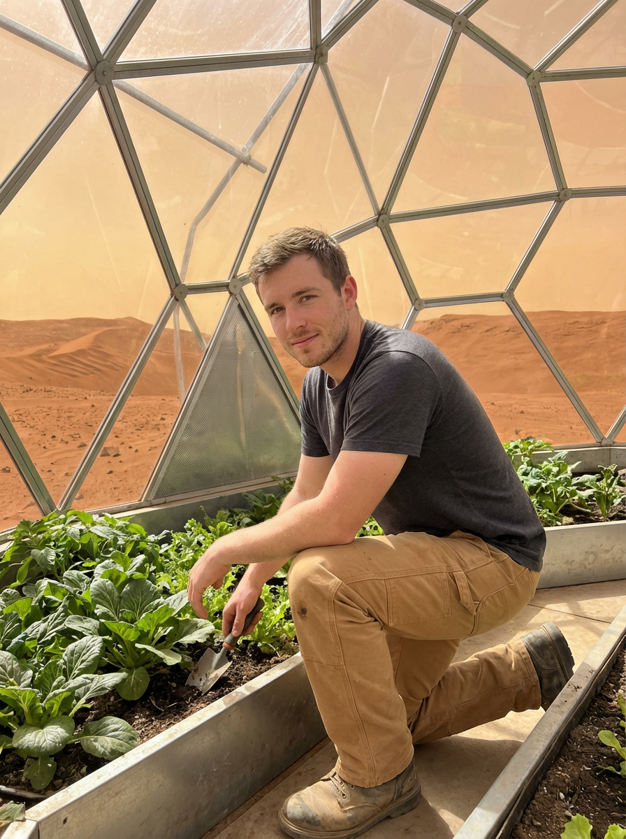model in a futuristic geodesic glass dome growing plants, fruits and vegetables on Mars, with the Mars red dunes visible in windows. model wears a t-shirt and work pants.