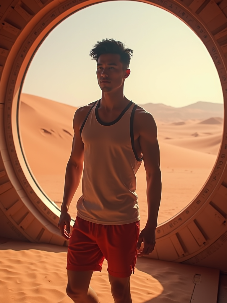 model in a futuristic gym on Mars with large windows. Mars red dunes in the big windows. model wears a tank top and shorts.