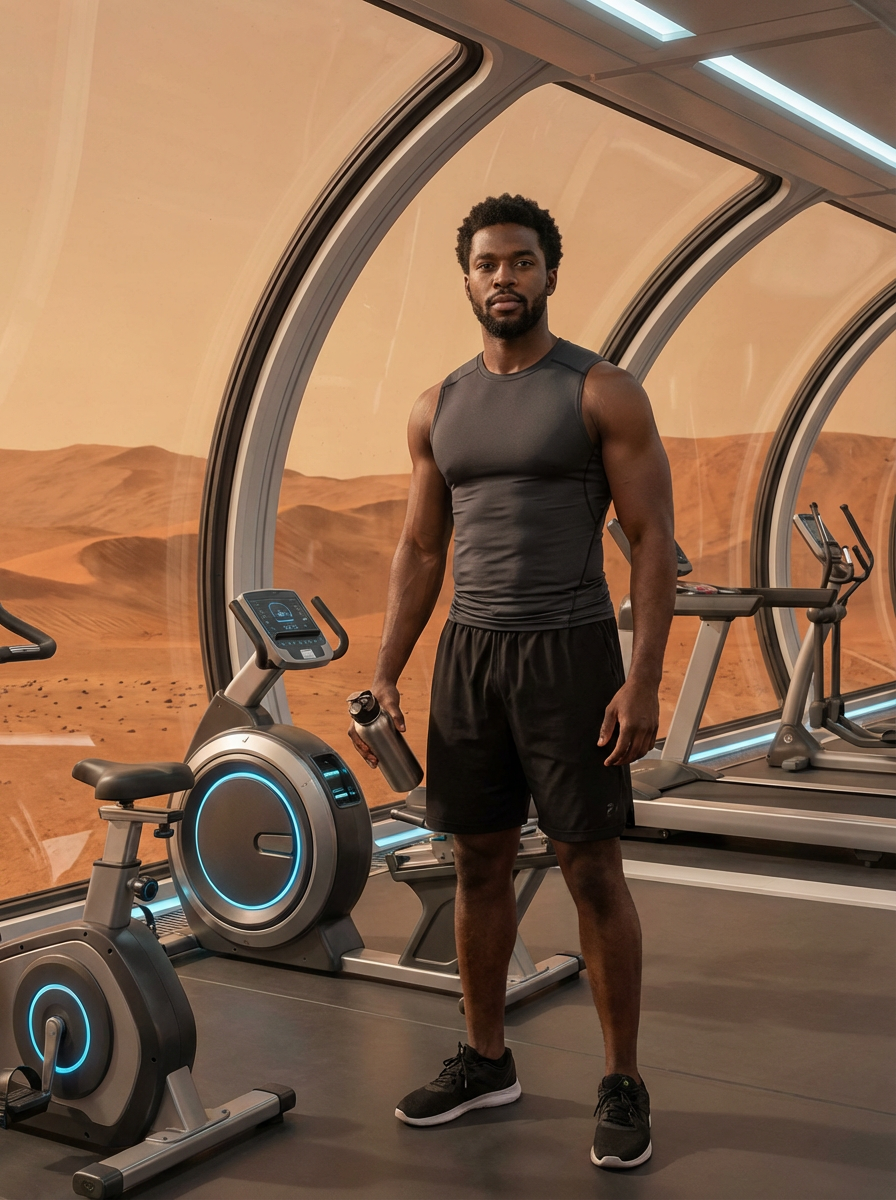 model in a futuristic gym on Mars with large windows. Mars red dunes in the big windows. model wears a tank top and shorts.