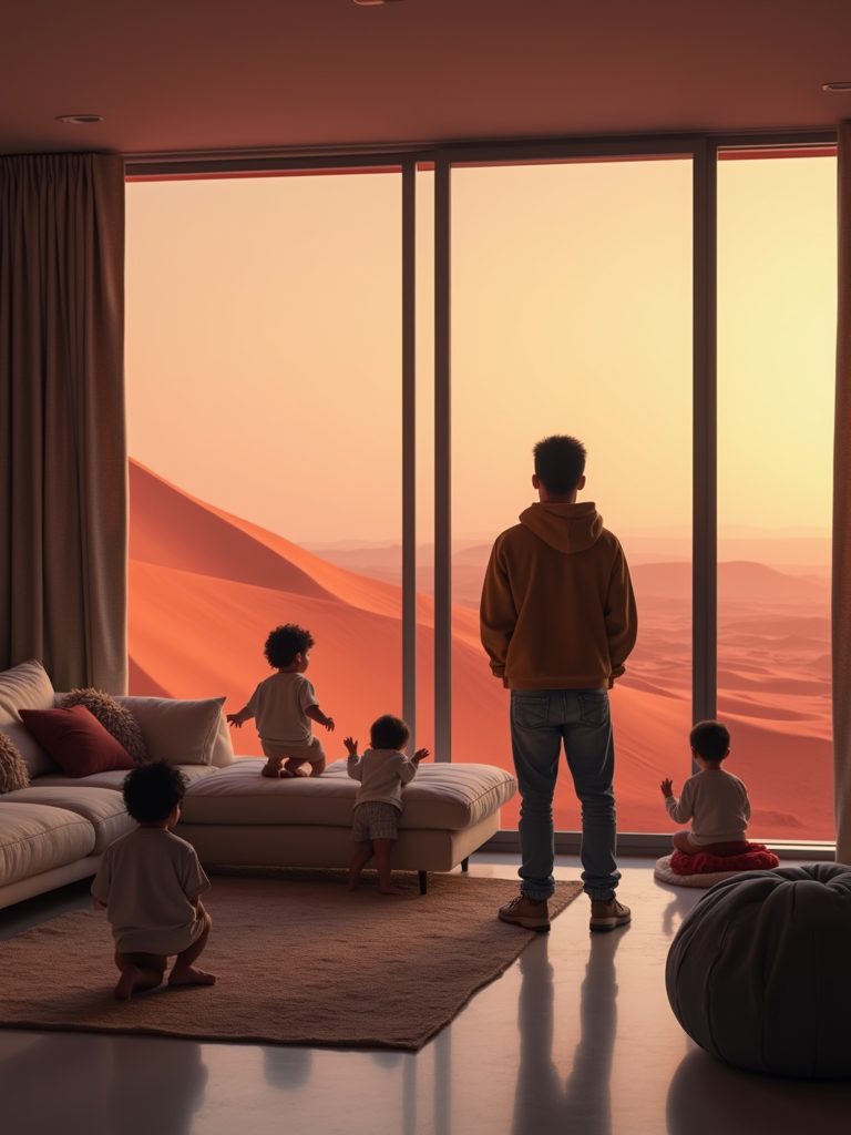 model in a futuristic living room with children playing. Mars red dunes is visible in big windows. model wears a hoodie and jeans.