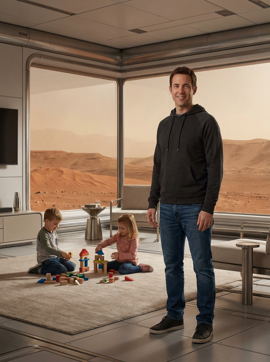 model in a futuristic living room with children playing. Mars red dunes is visible in big windows. model wears a hoodie and jeans.