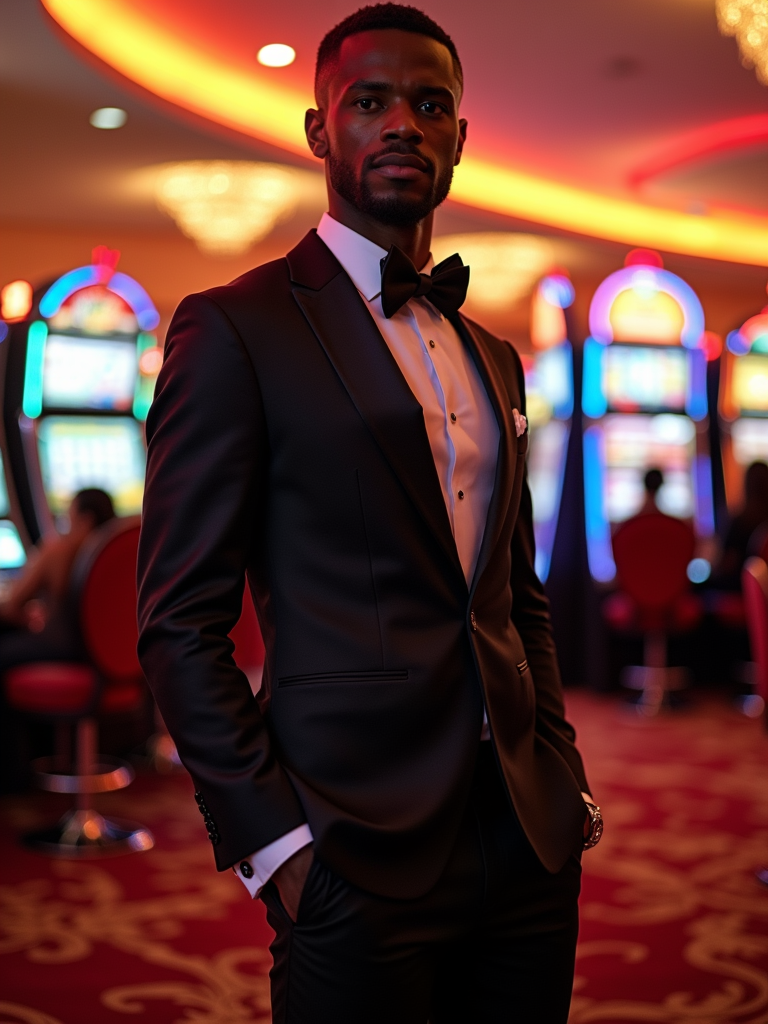 model in a glamorous casino on the Las Vegas Strip. at night. the model wears a sleek tuxedo with polished dress shoes, reflecting a luxurious and sophisticated look.