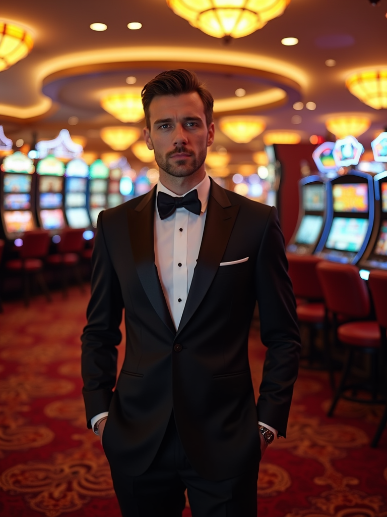 model in a glamorous casino on the Las Vegas Strip. at night. the model wears a sleek tuxedo with polished dress shoes, reflecting a luxurious and sophisticated look.