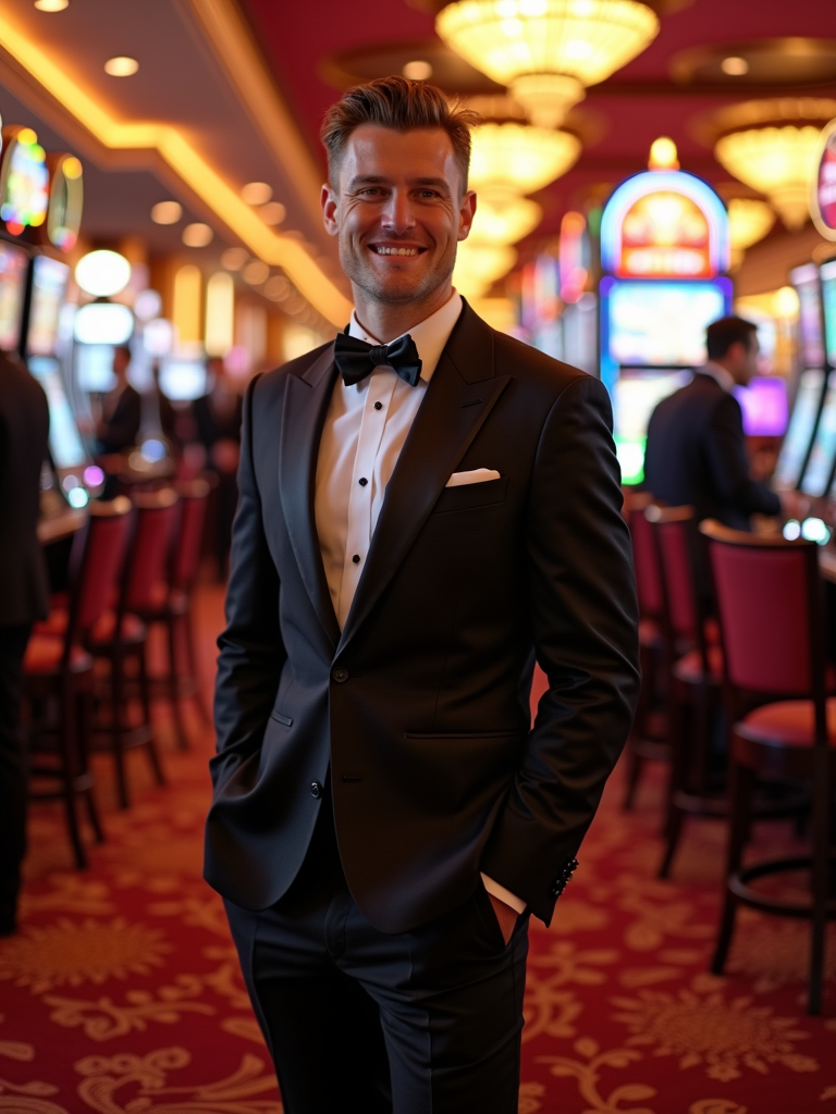 model in a glamorous casino on the Las Vegas Strip. at night. the model wears a sleek tuxedo with polished dress shoes, reflecting a luxurious and sophisticated look.