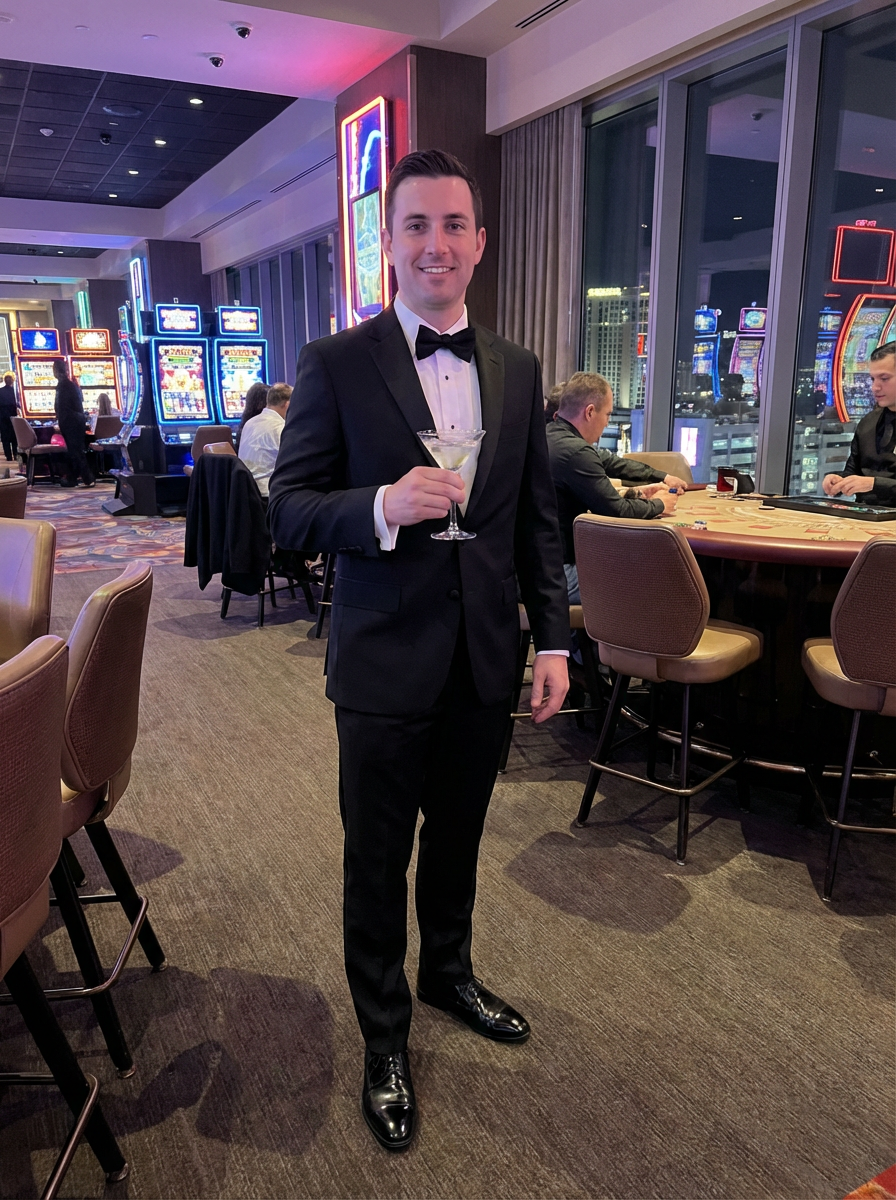 model in a glamorous casino on the Las Vegas Strip. at night. the model wears a sleek tuxedo with polished dress shoes.