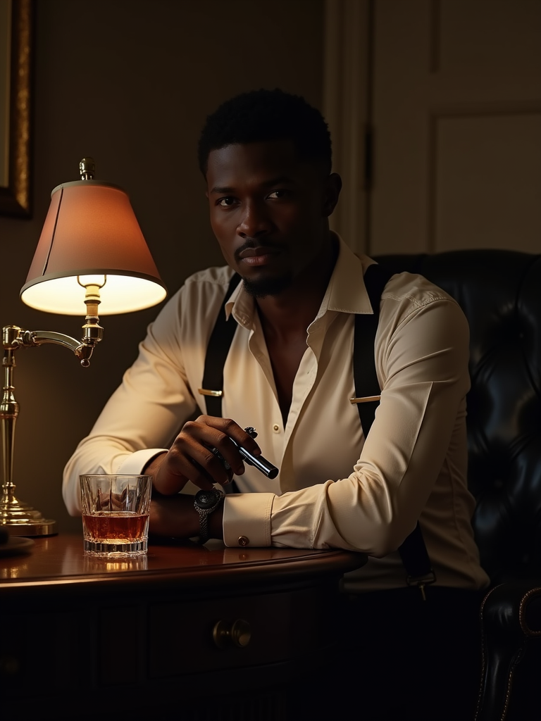 model in a luxurious office setting, wearing suspenders and rolled-up sleeves, sitting at vanity with whiskey glass and revolver, dramatic lighting from a single lamp, film noir chiaroscuro effect