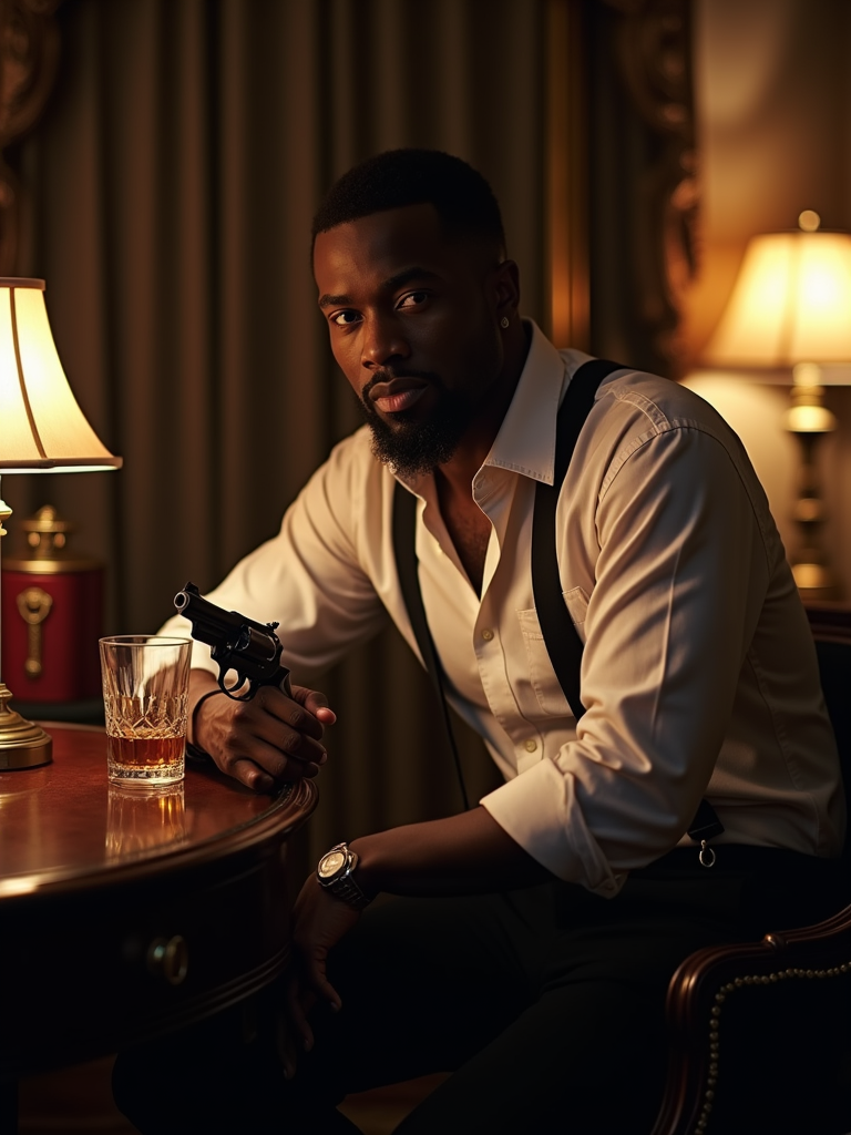 model in a luxurious office setting, wearing suspenders and rolled-up sleeves, sitting at vanity with whiskey glass and revolver, dramatic lighting from a single lamp, film noir chiaroscuro effect