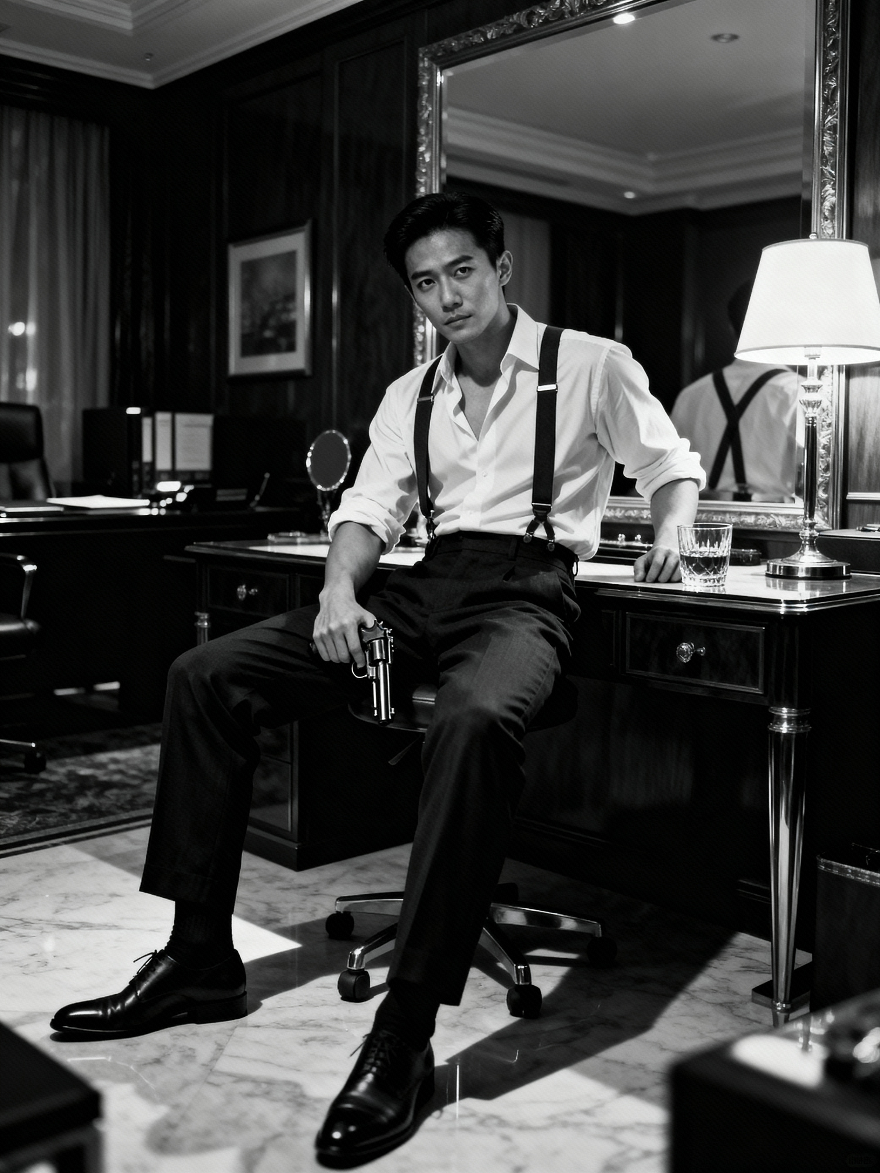 model in a luxurious office setting, wearing suspenders and rolled-up sleeves, sitting at vanity with whiskey glass and revolver, dramatic lighting from a single lamp, film noir chiaroscuro effect