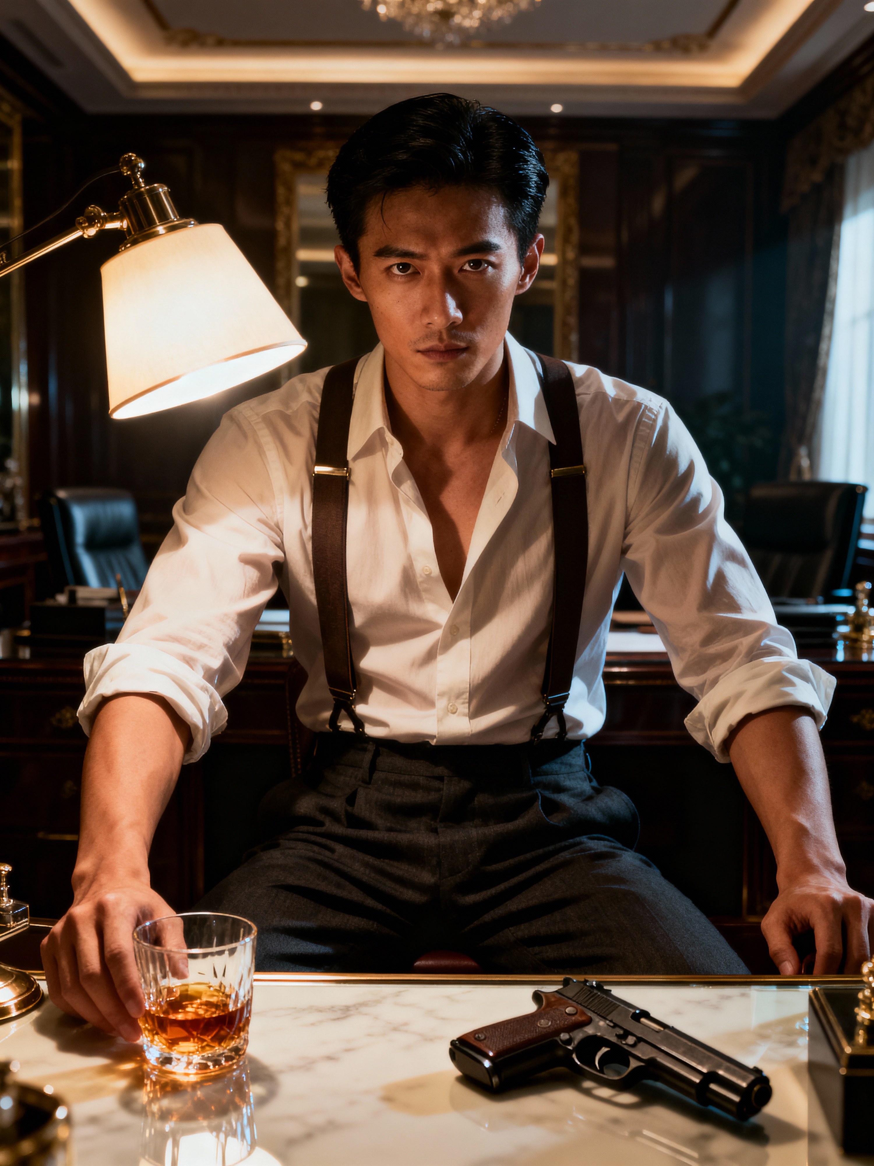 model in a luxurious office setting, wearing suspenders and rolled-up sleeves, sitting at vanity with whiskey glass and revolver, dramatic lighting from a single lamp, film noir chiaroscuro effect