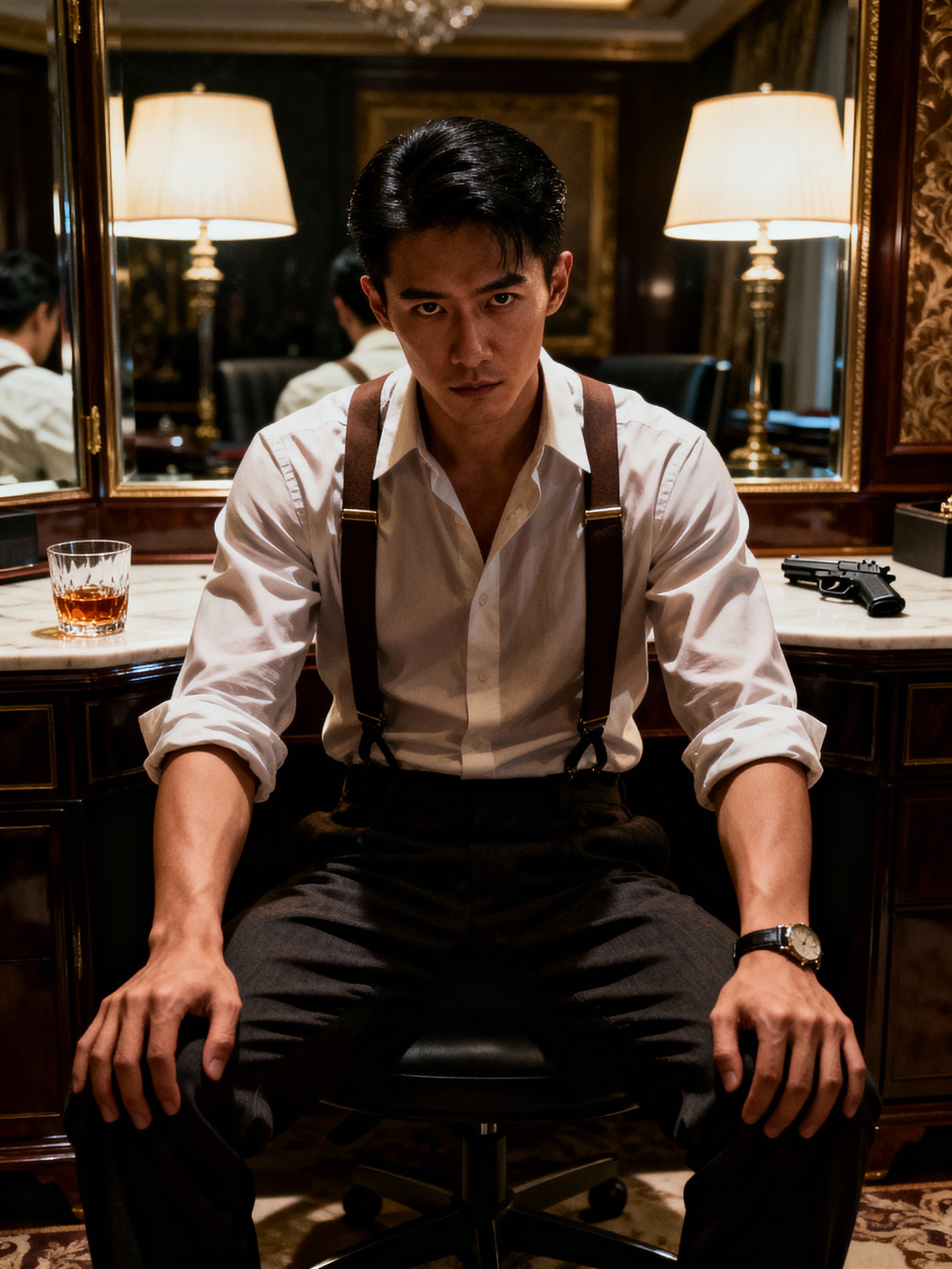 model in a luxurious office setting, wearing suspenders and rolled-up sleeves, sitting at vanity with whiskey glass and revolver, dramatic lighting from a single lamp, film noir chiaroscuro effect
