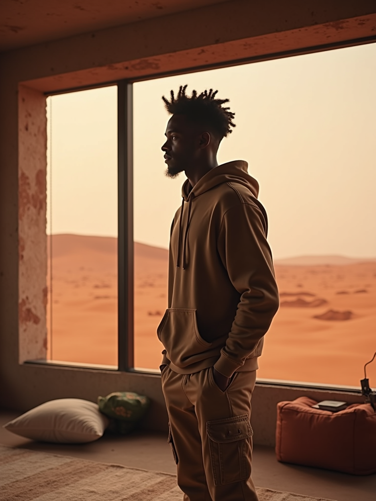 model in a modern living room on Mars with the Mars red dunes visible in the big windows. model wears a casual hoodie and cargo pants.