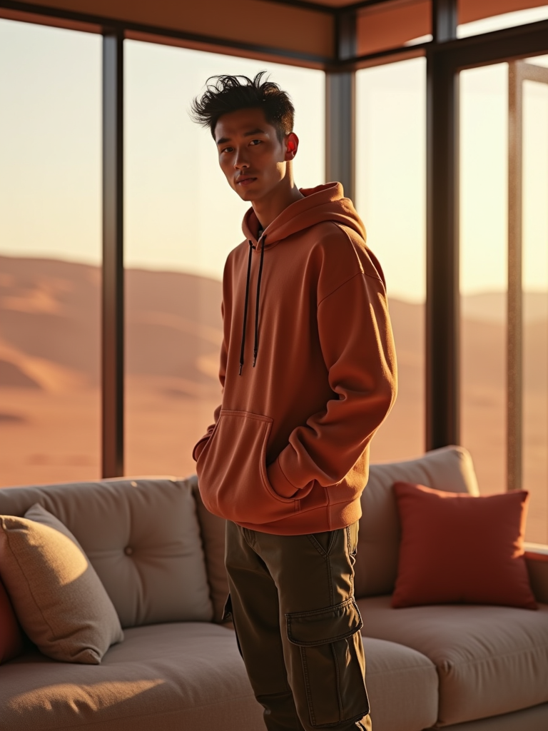 model in a modern living room on Mars with the Mars red dunes visible in the big windows. model wears a casual hoodie and cargo pants.