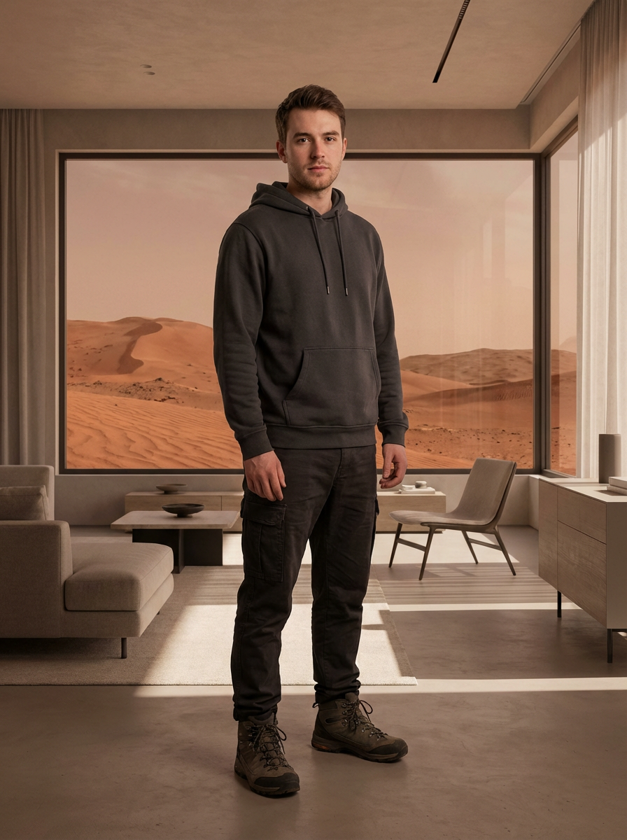 model in a modern living room on Mars with the Mars red dunes visible in the big windows. model wears a casual hoodie and cargo pants.