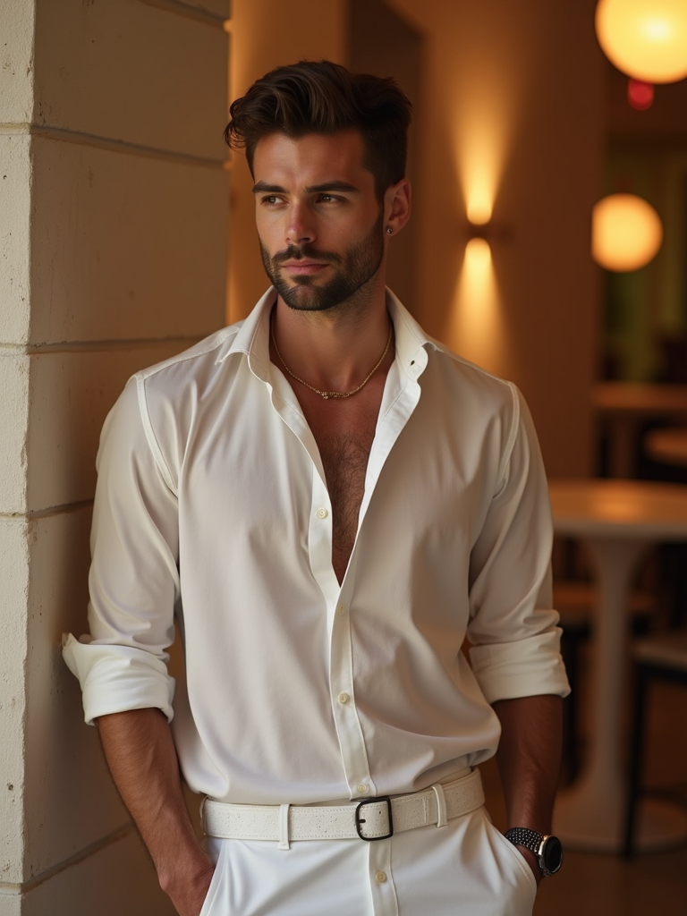 model in a Mykonos cocktail lounge, wearing white trousers with a light designer shirt, ambient lighting and stylish decor