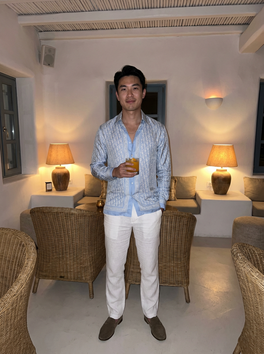 model in a Mykonos cocktail lounge, wearing white trousers with a light designer shirt, ambient lighting and stylish decor