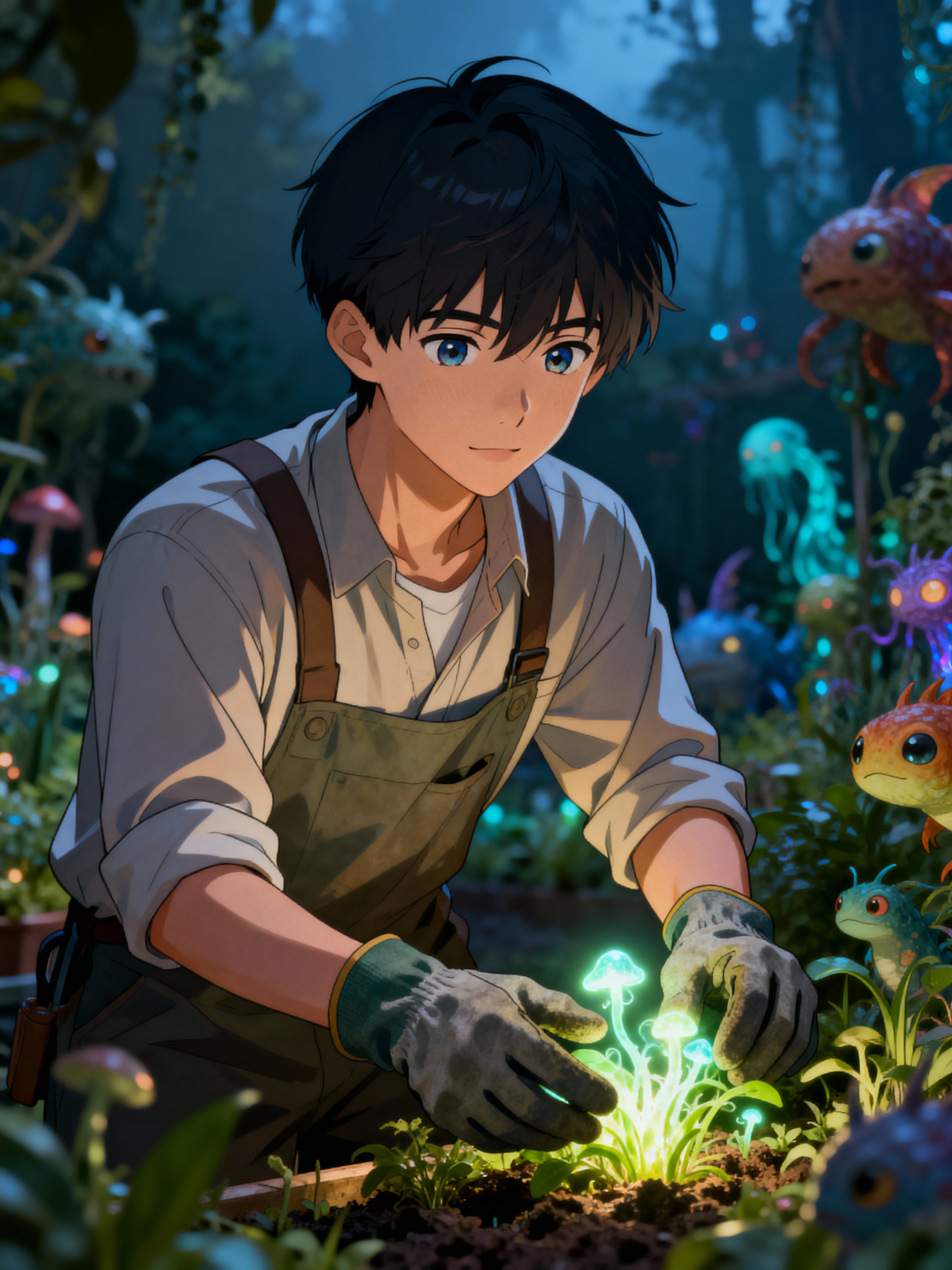 model in a peaceful line art anime portrait near a magical garden, with model as the character wearing simple work clothes with garden gloves, tending to mysterious glowing plants. The garden is filled with strange and wonderful creatures. The style is gentle.