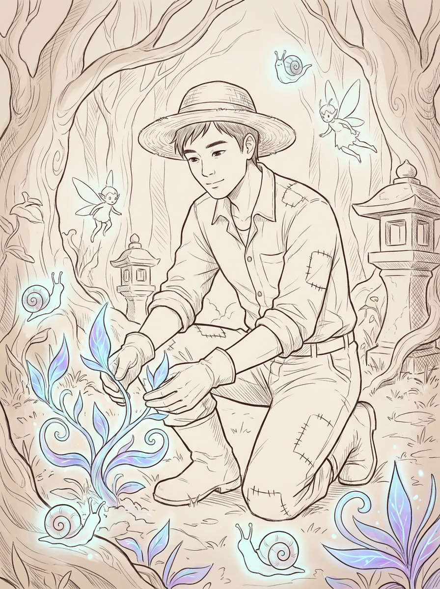 model in a peaceful line art anime portrait near a magical garden, with model as the character wearing simple work clothes with garden gloves, tending to mysterious glowing plants. The garden is filled with strange and wonderful creatures. The style is gentle.