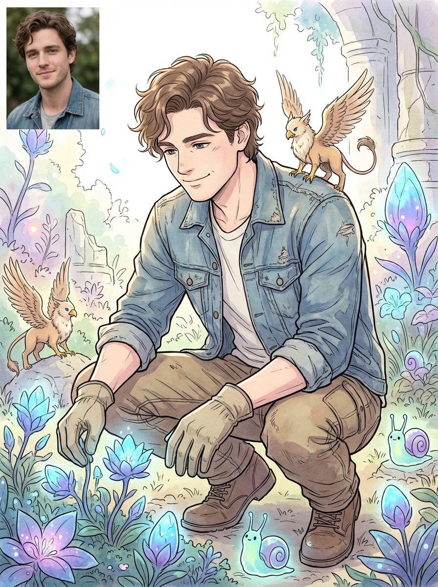 Related photosA heartwarming line art anime portrait in a cozy kitchen, with man wearing  comfortable home clothes, cooking magical food that glows and floats. The kitchen is filled with animated cooking tools and helpful spirits. The style is warm.A serene line art anime scene in a Japanese countryside. The path winds between traditional wooden houses and rice fields, with fluffy white clouds drifting overhead. Magical dust spirits dance in the warm sunlight that filters through the trees. In the foreground, man as a gentle character stands thoughtfully, wearing  light countryside clothes with rolled-up sleeves. The character has a kind expression, watching the spirits play. The scene captures the peaceful magic of everyday life, painted in soft, warm colors.A line art anime scene in a magical garden, with man as the character wearing  light gardening clothes with a sunhat, surrounded by giant flowers and tiny garden spirits. The garden feels alive with magic. The style is peaceful.handsome and stylish man showcasing a dappersuit in a bold plaid pattern with a solid-colored shirt and a knitted tieclose-up of Artistic makeup with face jewels and iridescent highlighter, captured under a UV light for a glowing effect. set against a soft, pastel backgroundsharp and trendy man in Bali wearing vibrant Batik clothes, Bali, Indonesia in the background