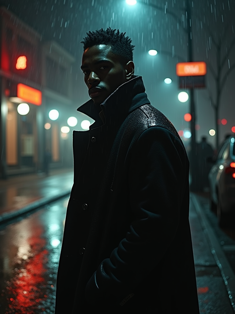 model in a rain-soaked city street at night, wearing a long trench coat with upturned collar, dramatic shadows from street lamps, reflections in puddles, film noir high-contrast lighting, mysterious expression