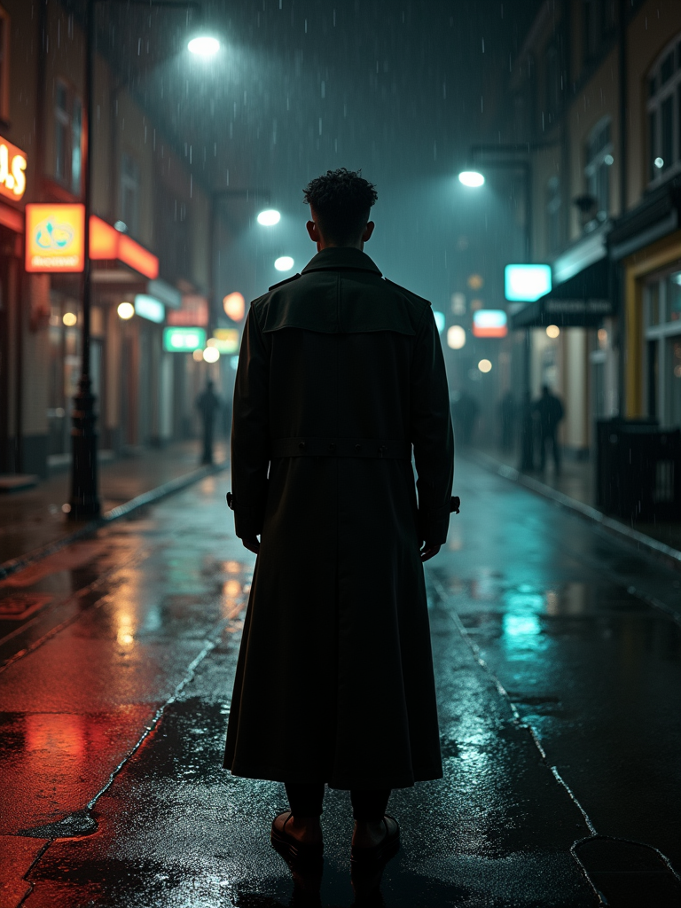 model in a rain-soaked city street at night, wearing a long trench coat with upturned collar, dramatic shadows from street lamps, reflections in puddles, film noir high-contrast lighting, mysterious expression