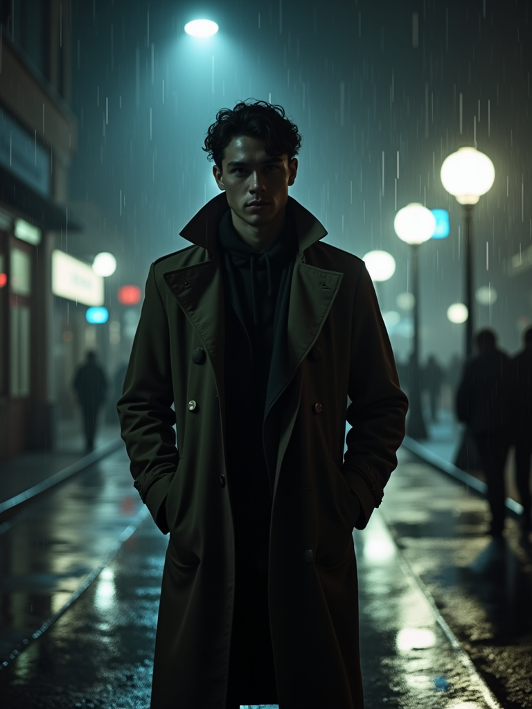 model in a rain-soaked city street at night, wearing a long trench coat with upturned collar, dramatic shadows from street lamps, reflections in puddles, film noir high-contrast lighting, mysterious expression
