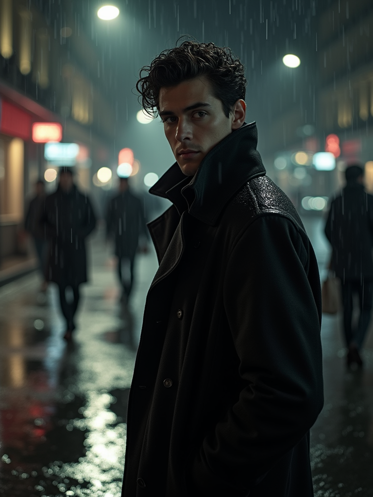 model in a rain-soaked city street at night, wearing a long trench coat with upturned collar, dramatic shadows from street lamps, reflections in puddles, film noir high-contrast lighting, mysterious expression