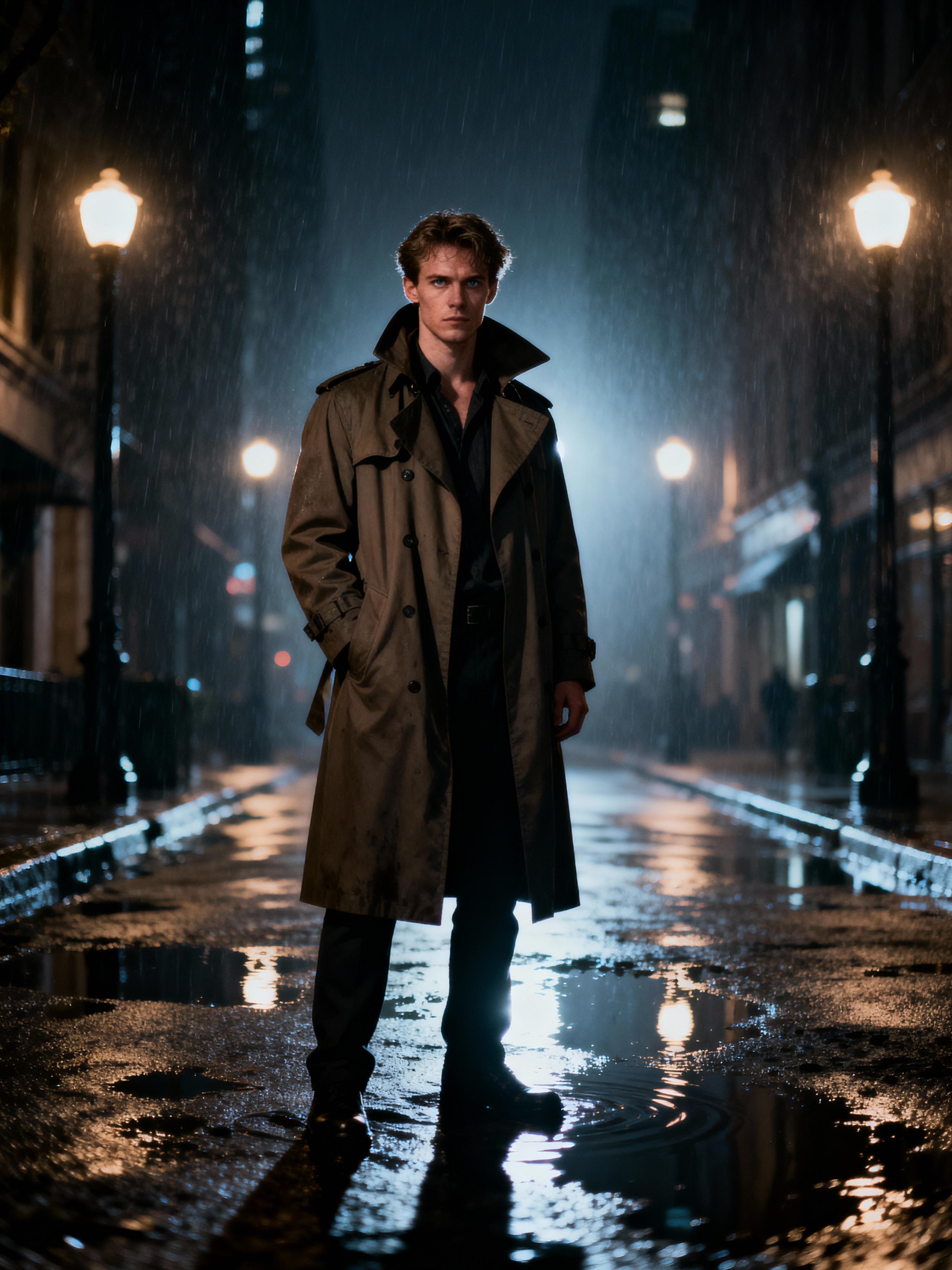 model in a rain-soaked city street at night, wearing a long trench coat with upturned collar, dramatic shadows from street lamps, reflections in puddles, film noir high-contrast lighting, mysterious expression