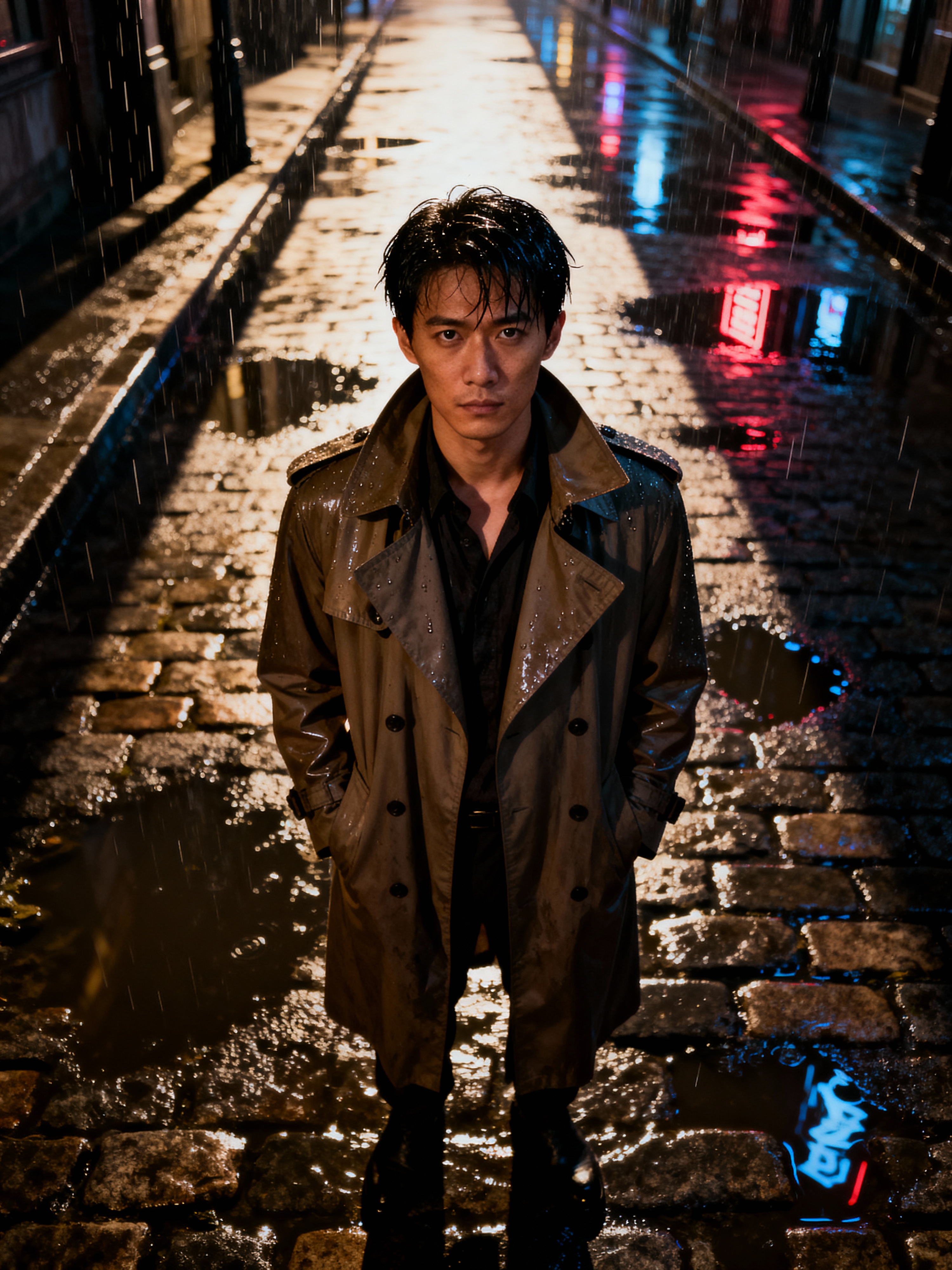 model in a rain-soaked city street at night, wearing a long trench coat with upturned collar, dramatic shadows from street lamps, reflections in puddles, film noir high-contrast lighting, mysterious expression