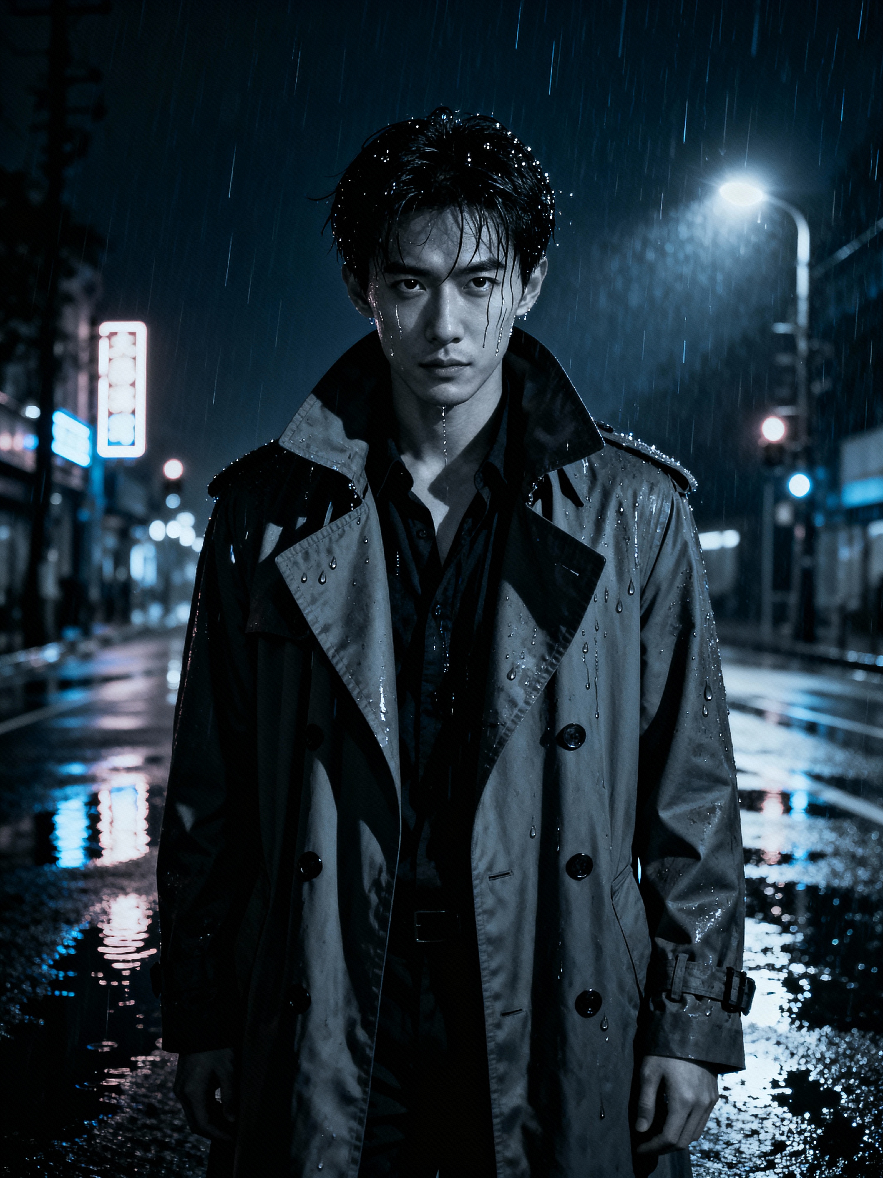 model in a rain-soaked city street at night, wearing a long trench coat with upturned collar, dramatic shadows from street lamps, reflections in puddles, film noir high-contrast lighting, mysterious expression