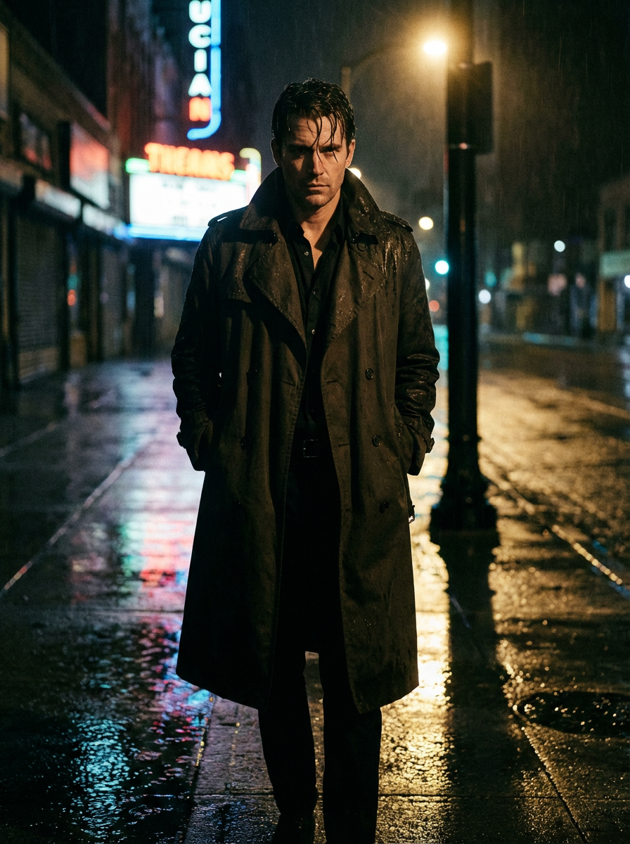 model in a rain-soaked city street at night, wearing a long trench coat with upturned collar, dramatic shadows from street lamps, reflections in puddles, film noir high-contrast lighting, mysterious expression